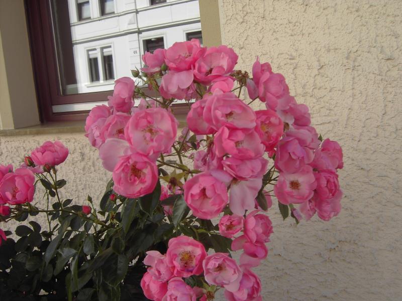 Im Laufe von 10 Jahren ist sie nun bei ihrer Endhöhe von ca. 1,5 m Höhe angelangt, sie ist also eine Strauchrose und eigentlich schon recht hübsch. Sie blüht üppig in großen Büscheln, ist eher nur sehr schwach gefüllt und nur wenig duftend. Kräftig pink in der Knospe wird sie im Aufblühen richtig rosa, was nach innen innen in ihrer Mitte leicht heller wird. Im Verblühen hellt sie noch mehr auf. Blüht nach Rückschnitt einmal nach und toleriert den ihr zugewiesenen Halbschatten wunderbar.