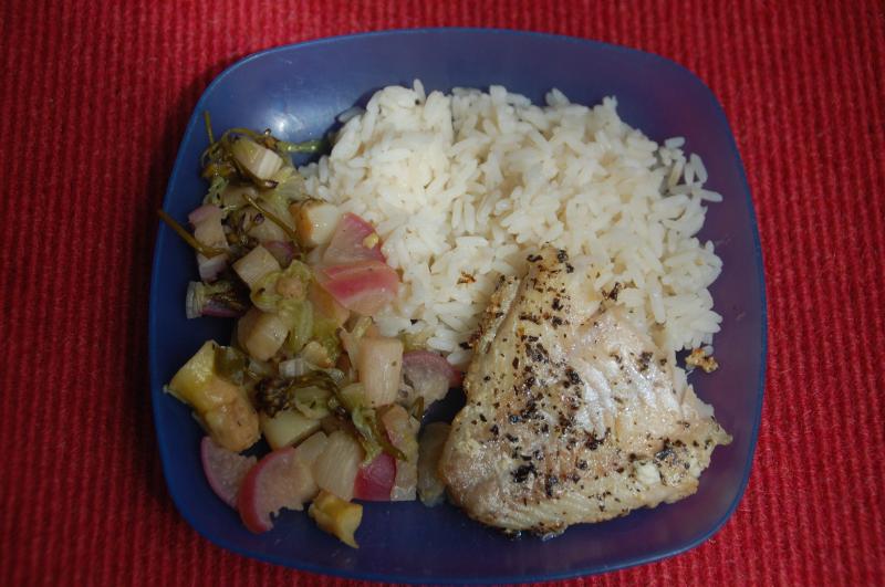 Kaffirlimettenreis, Rotbarsch in Kräuteröl gebraten, Gemüsepfanne (Spargel, Radieschen, Broccoliniknospen, Zwiebel, Chinakohl, Butter, Lorbeer, Thymian, Salz, roter Pfeffer)