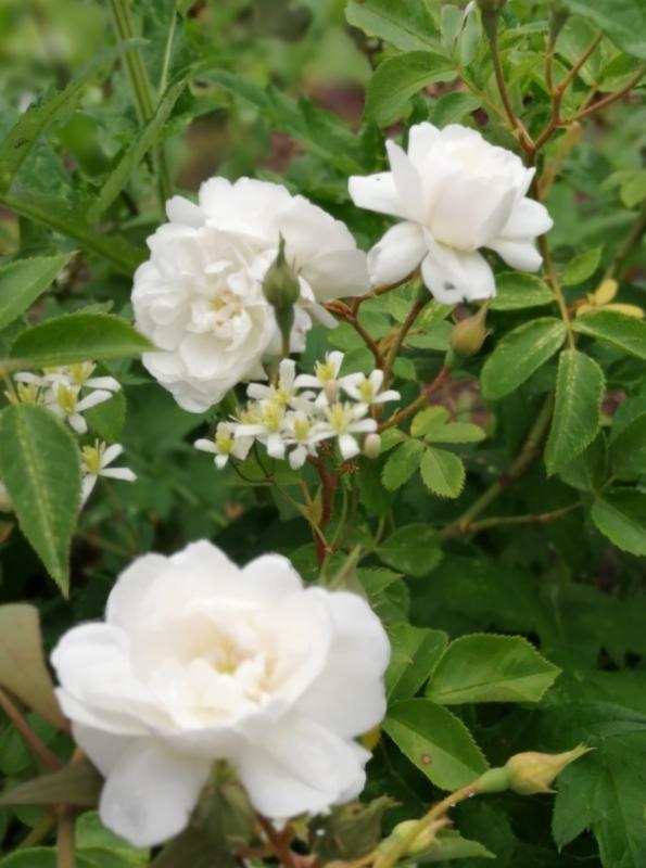 Madame d 'Arblay, hier zusammen mit Clematis recta, die bei mir nicht purpurea will, soll den Zaun verankern, ist aber erst letztes Jahr hier eingezogen. :D