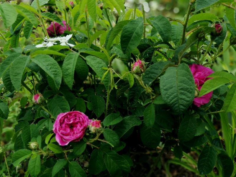 Die nackten Haxen von Charles de Mills haben mich im Frühjahr so genervt, dass ich ihn wider besseren Wissens auf ca. Kniehöhe runtergesäbelt habe. Zugunsten eines schöneren Strauches war ich bereit auf Blüten zu verzichten. Tja und jetzt: Gesundes Laub, Knospen ohne Ende und ca. 1m lange Neutriebe.