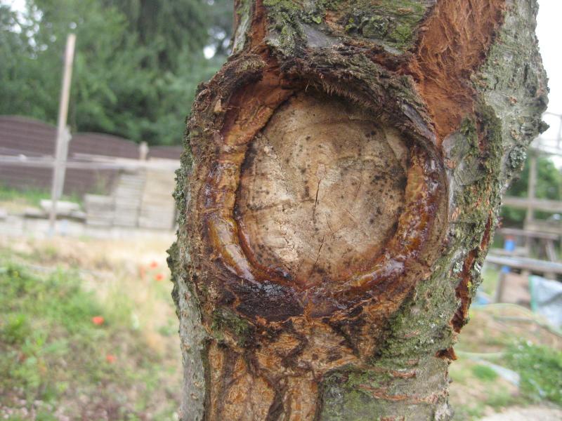 Naja, die Schnittführung finde ich nicht ok. Sieht sehr Stammparallel aus, Astring ist kaputtgesägt. Oben steht teilweiße zuviel, unten zuwenig. Deswegen kommt der Gummifluss auch nur unten raus. Die Holzbarriere ist jedenfalls verletzt und so können sich trotz Überwallung die Pilze ungehindert im Stamm ausbreiten.