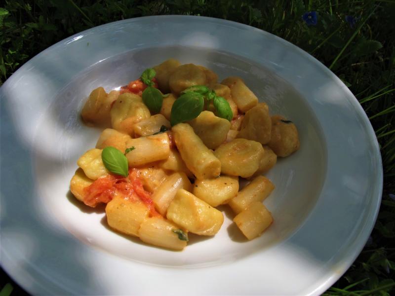 Letzte Woche am Land gab es Gnocci mit Spargel in einer leichten Sauce aus (wenig) Schlagobers, Parmesan und kleinen Tomaten nach einem Rezept, das ich dem dortigen Fast-Sternekoch abgejagt hatte. Muß noch perfektioniert werden (z.B. reifere Tomaten) und schaut ein bisserl blaß aus, war aber schon sehr gut :)