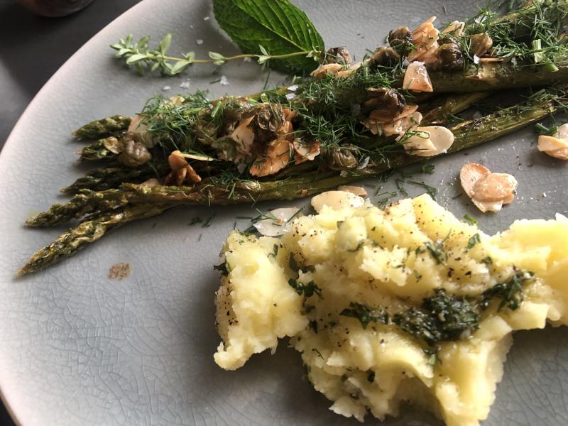 Bei uns gab es grünen Spargel aus dem Offen mit Mandeln, Kapern und Dill dazu aromatisiertes (Minze, Thymian und Zitronenschale wurde mitgekocht) Kartoffelpüree. Alles Rezepte aus dem Buch Simple von Yotam Ottolenghi :)