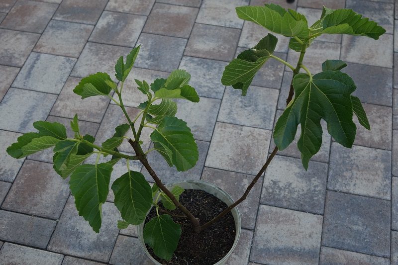 Vor knapp 4 Wochen lieferte mir Lubera die Ficcolino im 5 Liter Topf, ein cirka 80 cm hoher Busch mit drei unverzweigtenTrieben, die etwas dicker als Bleistifte sind. An einem Trieb hingen 2 walnussgroße Feigen, eine ist wegen meiner Ungeschicklichkeit abgefallen.
