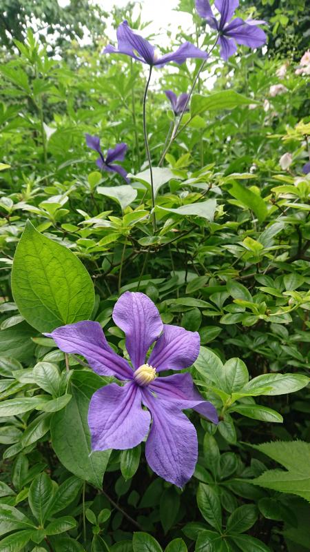 Praktisch und schön ist auch die Kombi von Azaleen (Knap Hill) mit C. ´Durandii`. Auch hier keine gleichzeitige Blüte, aber die ist auch nicht gewollt, da die abgeblühten Stände der Azaleen erst entfernt werden und danach Durandii den passenden Soloauftritt hat.