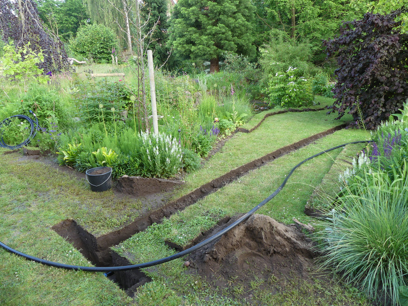 Die Gräben von Hausgeists GG sind an Akkuratheit ja wirklich nicht mehr zu überbieten, sind die per Laser ausgeschnitten? ;) Hier wäre das in der Form auch völlig unmöglich, selbst wenn der Boden nicht zu nass und nicht zu trocken wäre. Eigentlich müsste man ja gleich noch Stromkabel und Leerrohre 'reinlegen, dann lohnt sich die Buddelei gleich mehrfach.