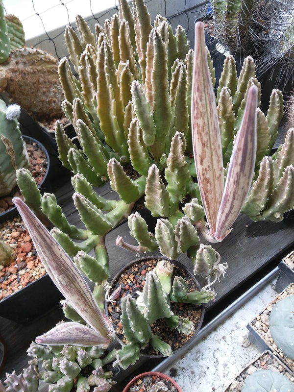 Hier hat sich Stapelia grandiflora irgendwie verrannt. Die Knospen sind geteilt, keine Ahnung warum. Manche der Abteile haben 2 Blütenblätter, andere bestehen nur aus einem. Habe ich auch noch nicht gesehen. Sie sind auch viel länger als sonst üblich. Woher kommt sowas? Kälteschaden?