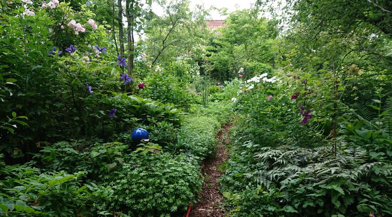 Bin gerade von der Bank am Ende des Grundstücks vor dem Gewitter ins Haus geflohen und habe noch schnell ein Handybild geschossen. Es ist schön, eine verwunschene Ecke zu haben, in die man sich zurückziehen kann, ganz im Sinne von V. Sackville-West: "Manchmal sitze ich und denke. Und manchmal sitze ich bloß." Das ist meine "bloße" Ecke!