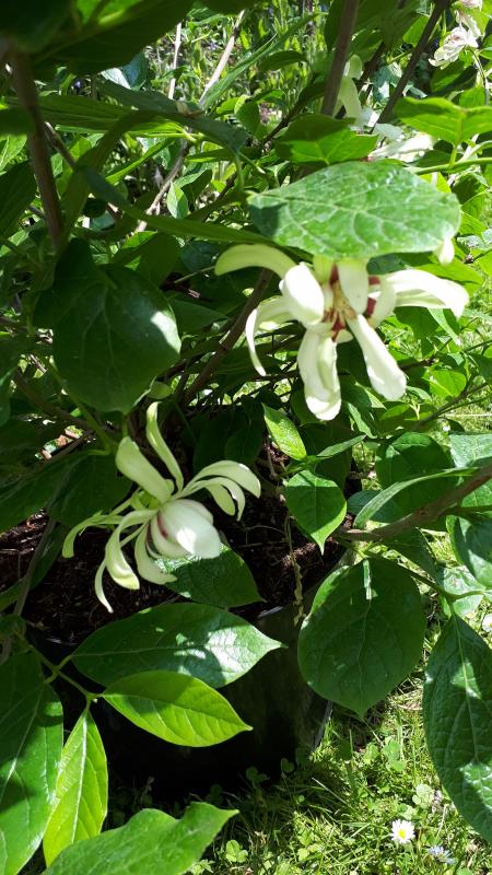 'Venus' blüht kurz nach der Hauptblüte von 'Hartlage Vine', und der ist hier gerade langsam im Abblühen. Sinocalycanthus hat auch erst erbsengroße Knospen.