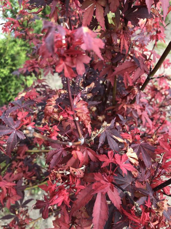 Er treibt immer schön aus, bekommt rote, saftige Blätter und dann mitte Mai, fangen die Blätter an auszutrocknen, obwohl er regelmäßig gegossen wird.