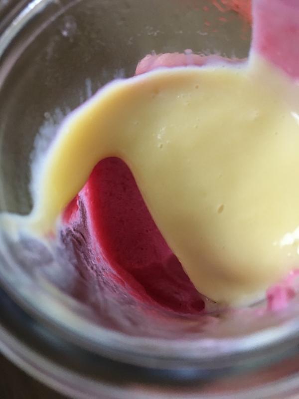 Zum Nachtisch Loganbeerenmousse mit Vanillesoße