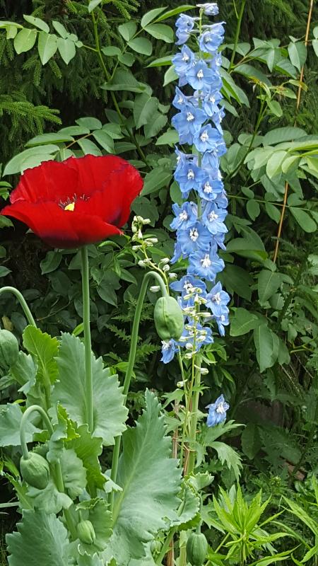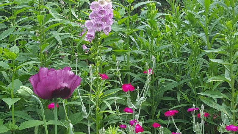 Nicht vorgesehene Farbtupfer ( Vexiernelke, Fingerhut, Mohn ) vor geplantem ( Helenium)