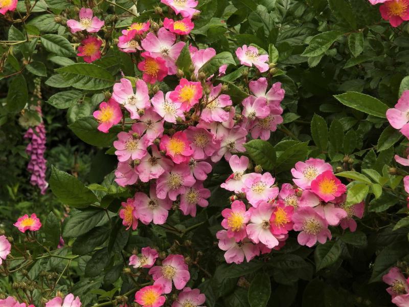 Blüten von Blush Hip im Gesträuch .Die Blättchen sind ganz zart und zeigen eine eigene Erlebniswelt.Mal ganz rosé ,mal regelrecht errötend.