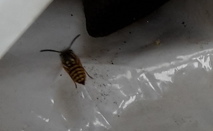 Auf meinem Balkon haben sich Insekten ein Zuhause gesucht, seit einigen Tagen beobachte ich, wie die Tiere in eine Plastetüte hinein und aus ihr heraus krabbeln. In der Tüte befinden sich zusammen gefaltete Stücke von so einer silbrigen Autoscheiben-Abdeckung (die verwende ich auf dem Balkon bei Frostgefahr zum Abdecken). Die Insekten sehen Wespen ähnlich, sind aber etwas kleiner als die gewöhnliche Deutsche Wespe (die immer so gern am Pflaumenkuchen nascht), und auch dunkler. Am Hinterleib sind schmale gelbe Streifen, nicht so markant wie bei der gewöhnlichen Wespe. Leider konnte ich noch kein Foto machen, sie sitzen kaum, fliegen direkt los, wenn sie aus der Tüte raus gekrabbelt kommen.