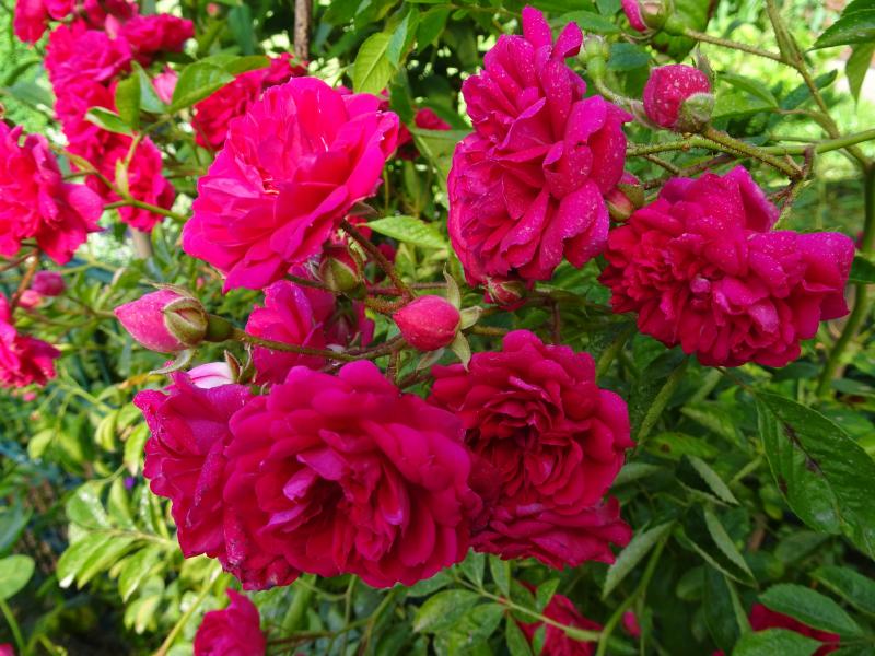 Ja,ich war auch heute noch außen an meiner Rosenhecke und hab Fotos gemacht.Die von HG.sind wohl besser.Auffällig sind die weißen Strichelungen,aber das zeigen auch andere rote ,kleinblütige Rambler. Blüten sind auch an der Sonnenseite nur 3-4 cm groß.