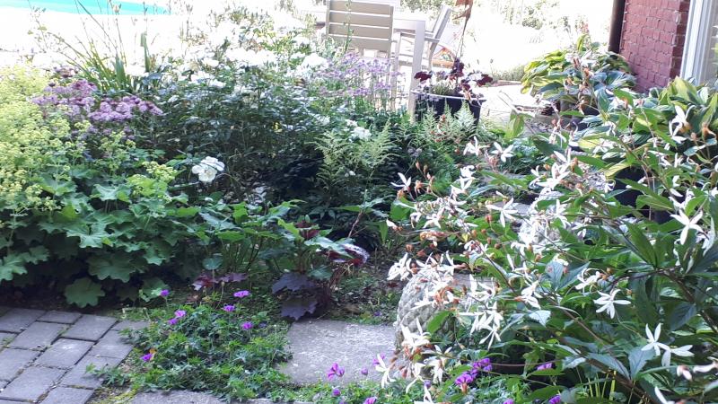 Das ist der älteste Gartenteil unter der Felsenbirne ( jetzt im 5. Jahr) und am Morgen eines heißer werdenden Tages noch recht lauschig. ;D