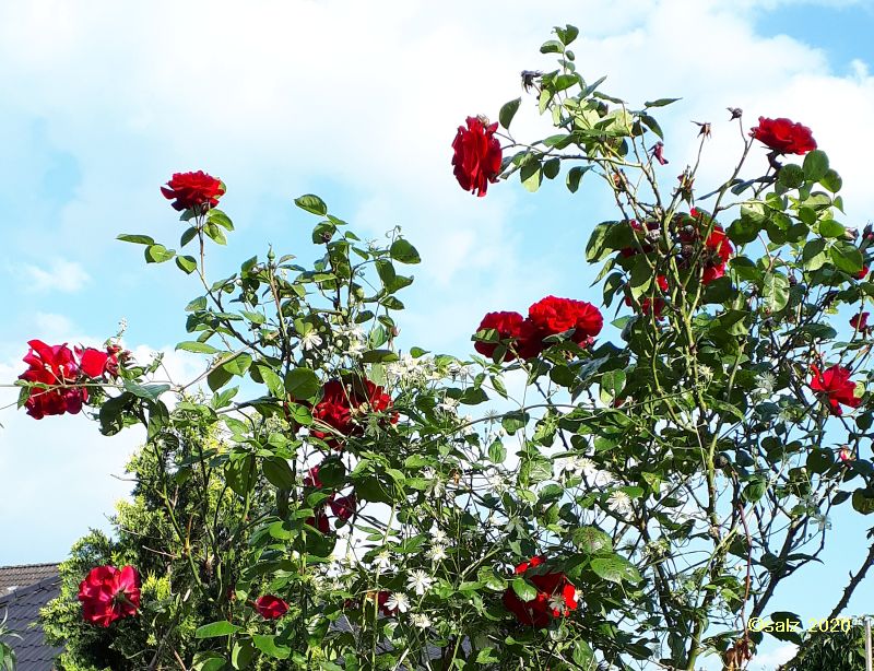 Eingangsbereich mit Rosenbogen. Mit der weißen Unschuld und der roten Belkanto (die noch nicht in Vollblüte steht)