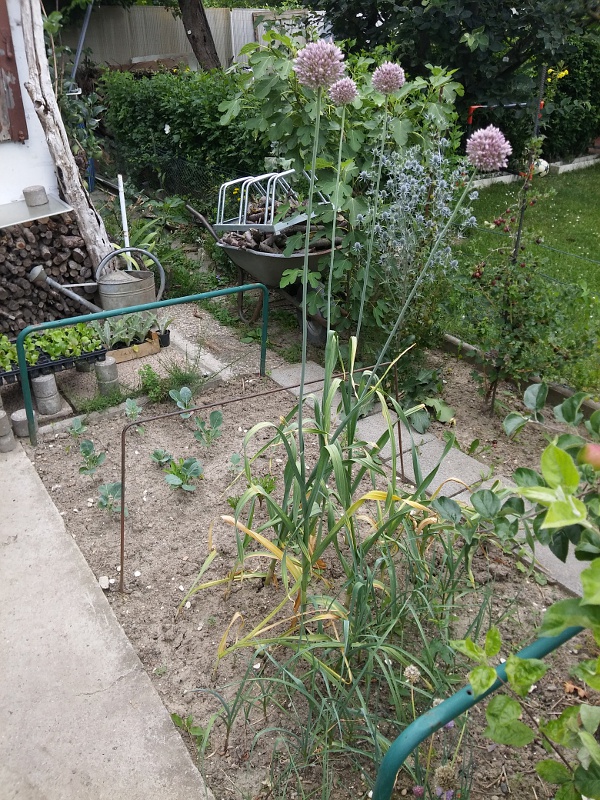 Ajo chilote ist in Blüte, zumindest manche. Da war der Unterscheid die Knollengröße. Ich verstehe ihn noch nicht. Wann macht er Monozehen, wann macht er große Knollen mit vielen Zehen und wann blüht er?