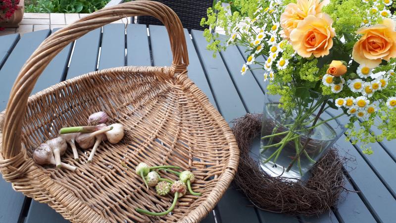 Als Neuling in Sachen Gemüseanbau zeige ich heute mal meine Knoblauchernte aus einer Zehe, die ich neben einen Rosenstrauch gesteckt hatte. Soll den Rosen ja gut tun... ;)
