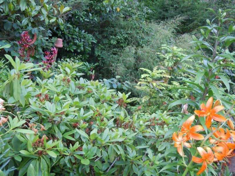 Mittlerweile sind auch einige nichtasiatische Arten eingezogen. Fuchsia regia ssp. reitzii z..B Sie ausläufert quer durch das Beet. Erstmals ist sie nicht zurückgefroren. Auch Lamium und Acanthus haben sich hineingesät.
