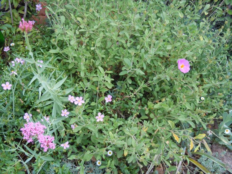 Cistus incanus var. tauricus, wenn ich nicht irre. Leider nur noch eine Blüte. Dazwischen wuselt ein wildes Helianthemum aus Finale Ligure mit zartrosa Blüte.
