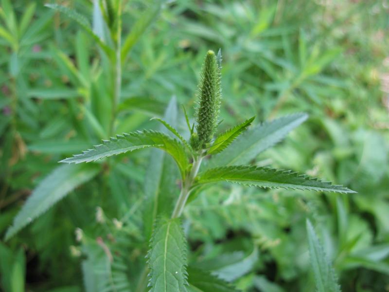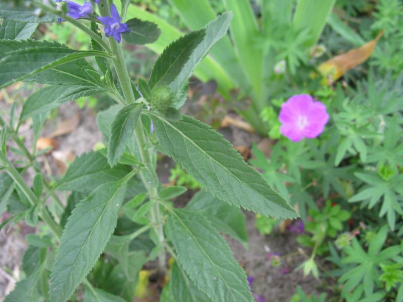 Es ist einer von vielen Sämlingen, die bei mir in Pflasterfugen auflaufen. Sie ist nur 40 cm hoch und der Blütenstand hat eine Länge von 12 cm. Sie steht auf sandigem Boden in voller Mittagsonne und kann damit wohl recht viel Trockenheit vertragen. Ich tippe daher auf V. spicata aber ich finde im Netz keine Fotos von Pflanzen dieser Art, die nicht nur einen einzigen terminalen Blütenstand entwickeln sondern unterhalb noch drei bis vier weitere entwickeln.