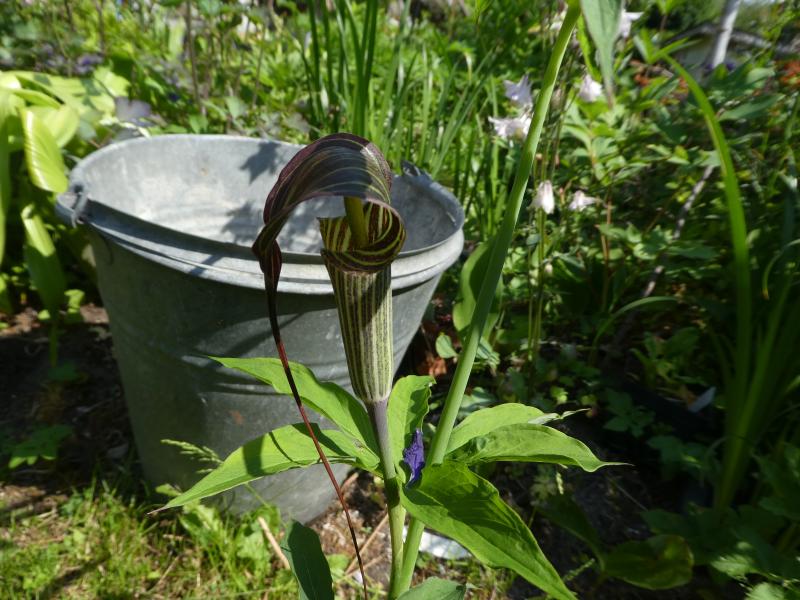 Von Arisaema candidissimum sind hier gerade die Spitzen aufgetaucht.