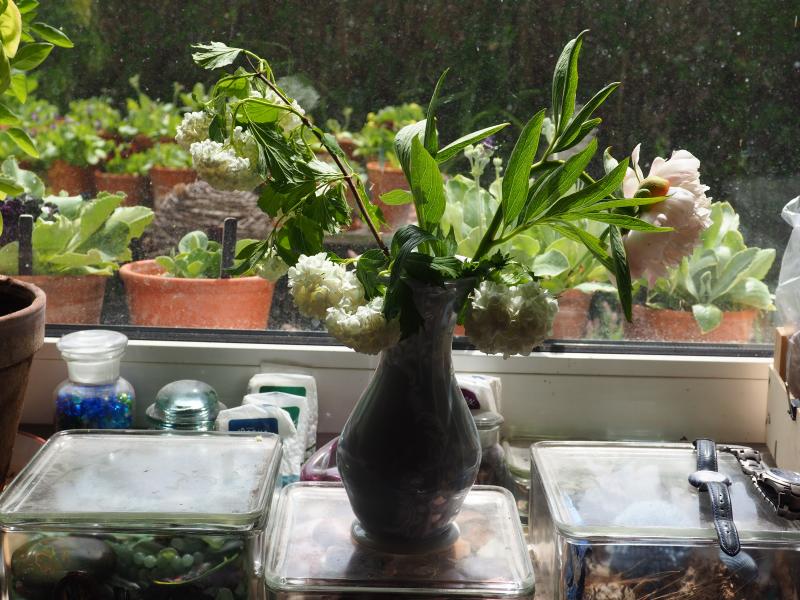 vorgestern aus dem Garten mitgenommen, heute fotografiert, in mitgenommenem Zustand. Schneeball mit Paeonia officinalis 'Alba Plena' in Rosenthal Sanssouci.