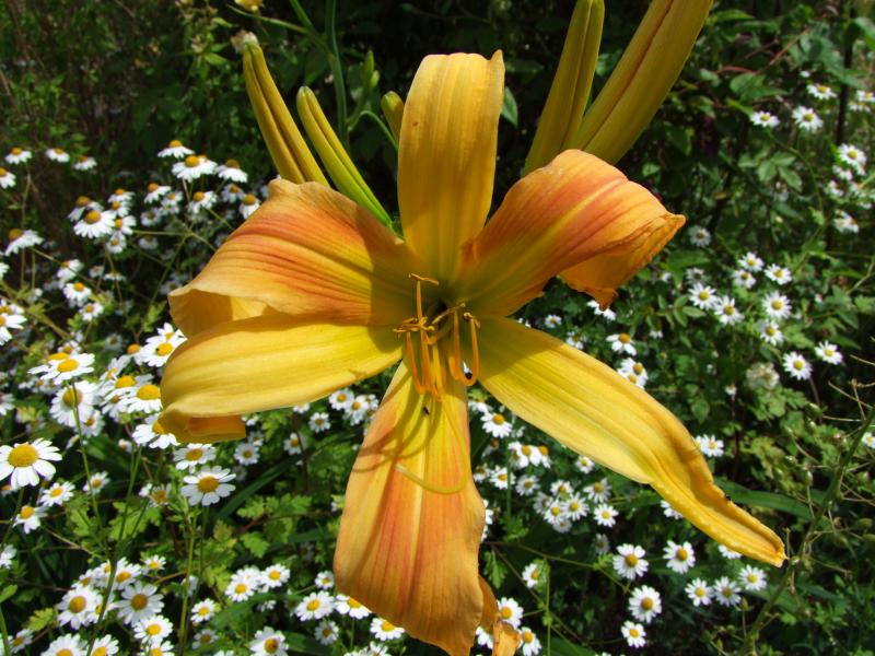 Ich habe ja nur eine einzige Taglilie gekauft - aber was fuer eine! Nach 2 Jahren warten blueht Lady Inara. Das Bild wird ihr nicht gerecht, aber dieser warm-pfirsichige Schlund und die pastellig-zarten Farbwogen zwischen Apticot und Muschelrosa sind einfach atemberaubend huebsch. Es wird schwer, je eine nach meinem Geschmack ebenbuertige weitere Hemerocallis zu finden.