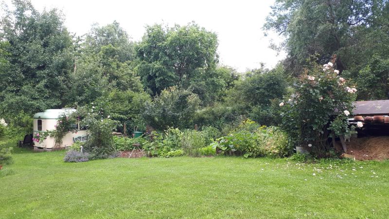 Also zuerst die Kitschidylle am Wohnwagen, auf dem ersten Beet stehen Kartoffeln und ein Rhabarber, der noch umgesetzt werden muss.