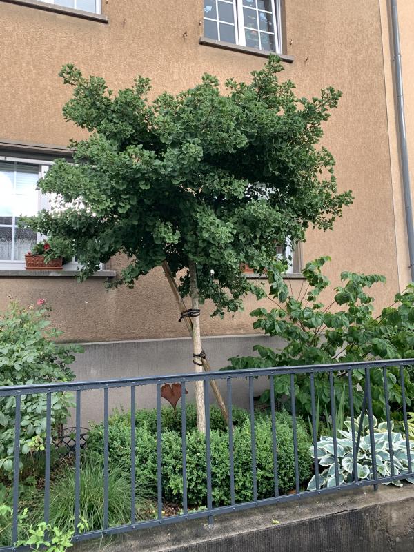 Ich sende mal ein Bild von unserem 8-jährigen Ginkgo Mariken. Er wird ungeschnitten im „Alter“ eher malerisch überhängend , anfangs sah er aber auch ähnlich aus wie oben auf dem Bild. Durch Kürzen der Langtriebe nimmt das Dickenwachstum des Stammes rasch zu und der Baum gewinnt zunehmend an Stabilität. Stützen braucht er anfangs in jedem Fall.