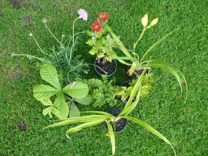 Chrysanthemum x hortorum ` Citronella` Chrysanthemum x hortorum ´Weserstein´ blüht sogar jetzt schon Hemerocallis x cult. `Earl Shnow` Hemerocallis x cult. ´Bed of Roses´ Scabiosa columbaria ´Pink Mist´ Rodgersia aesculifolia Polystichum sentif. `Plumosum Densum `