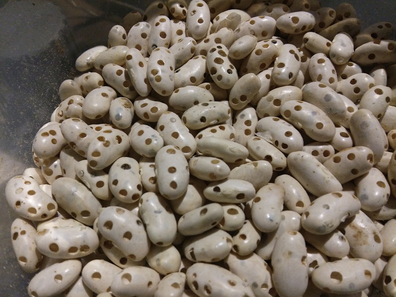 Bei der eigenen Bohnensaatguternte sammle ich lieber früher als später aus der Schote und lasse nachtrocknen, ohne Pilz und weniger Bohnenkäfer. Auch alles was etwas hellbraune Ecken hat, wird aussortiert. Anbei ein Foto von in der Gartenlaube vergessenen Bohnen. Der Nachbar hatte sie 2 Jahre vergessen und offen stehen lassen. Ist jetzt nur noch Dünger.