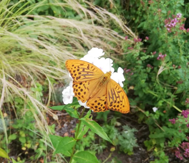 Gerade eben im Zweitgarten gesichtet: Argynnis paphia, der Kaisermantel (leider nur ein Handybild, die Kamera liegt zuhause :'().