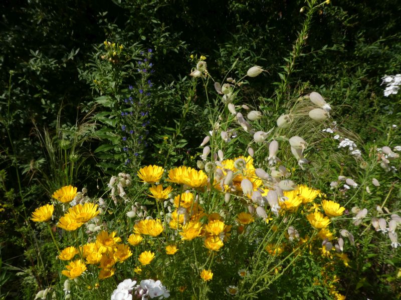 Das Beet am Hang ist derzeit etwas wild, ich müsste irgendwann mal das eine oder andere zurückschneiden, und natürlich will auch das Unkraut wieder eingedämmt werden, aber die Blütenpracht ist immer noch umfangreich; neben den Margeriten ist nun auch Allium 'Summer Drummer' aufgeblüht, und Allium 'Miami' sorgt mit den eintrocknenden Blütenbällen ebenfalls für einen Hingucker-Effekt.