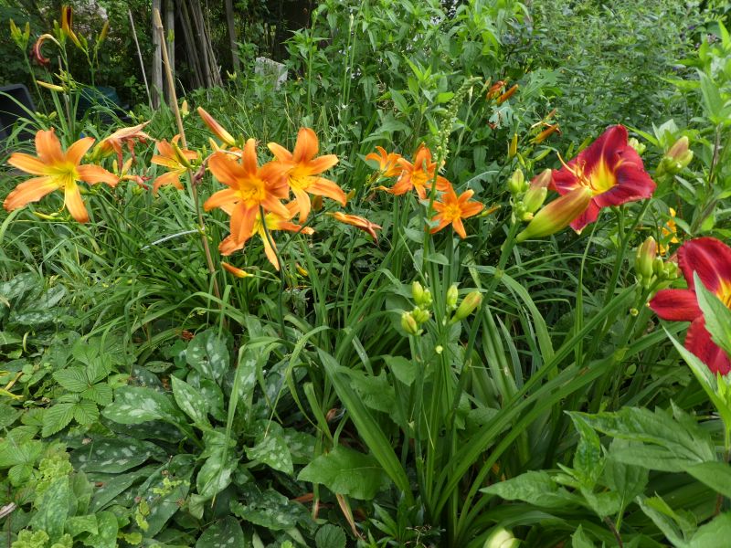 Der Juli ist die Zeit für einige feurige Stauden wie Montbretien und Taglilien, so intensiv glühen die Farben im Garten nur selten. Ein wenig fehlt im Moment wie gesagt die Sonne, aber das ist mir ausnahmsweise ganz recht, denn draußen ist es deutlich angenehmer als bei den mittlerweile üblichen Hitzewellen im Sommer.