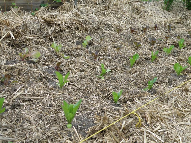 Allerdings hat das Mulchmaterial von der Salatpflanzung nicht ganz für das Romanasalatbeet gereicht und wir haben noch etwas mit Miscanthus nachgefüttert, um auch eine gute Bodenbedeckung zu haben.
