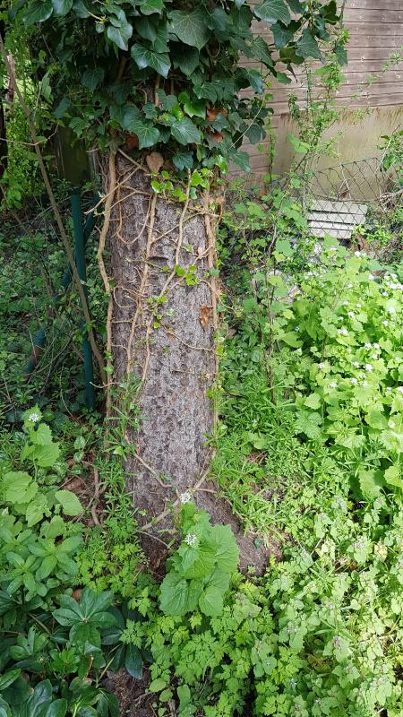 Dieses Bild gehört jetzt hoffentlich der Vergangenheit an. Rindenschaden an Apfel. Alle jüngeren Obstgehölze haben nun Baumschutzspiralen.