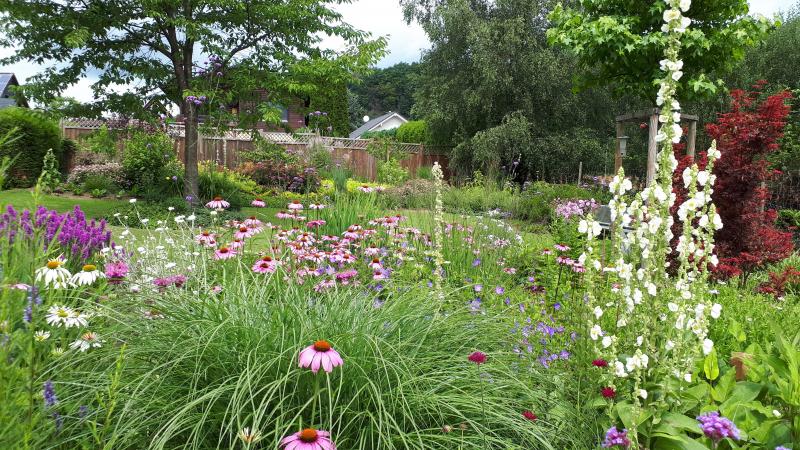 Nun setzen Verbena Bonsariensis und Echinacea die Akzente und auch die Gräser kommen voran. ;D Aber immer noch Königskerzen... irre lange Blütezeit und auch nachher sind die Samenstände lange noch schön. 8)