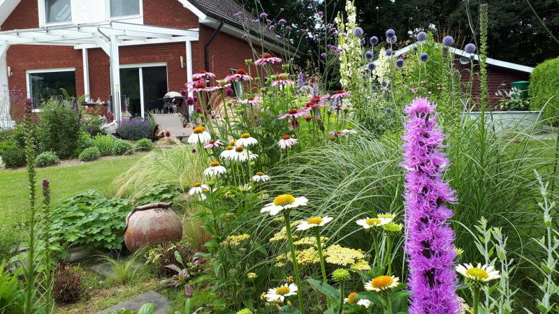 Nun setzen Verbena Bonsariensis und Echinacea die Akzente und auch die Gräser kommen voran. ;D Aber immer noch Königskerzen... irre lange Blütezeit und auch nachher sind die Samenstände lange noch schön. 8)