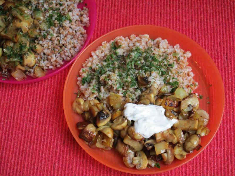 Hafer mit Champignonpfanne (+ Zwiebeln, Leinöl, Salz, Szechuanpfeffer), gemischten Kräutern und Kräuter-Creme fraiche.