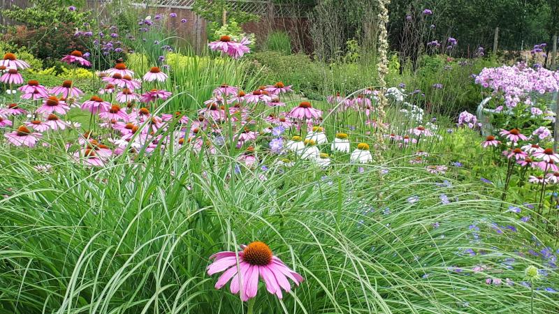 Der Ausblick, die Weite, das Prairie/wiesenartige in üppiger, bunter, ist auf jeden Fall das große Thema deines Gartens - aber du hast auch sehr schöne Räume mit der Beetführung und den gepflanzten Bäumen geschaffen.