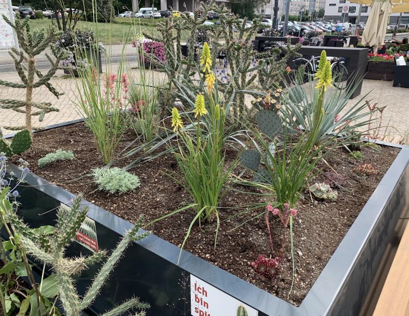 Kakteen-Haage hat heute mitten in der Stadt ein Hochbeet mit Freilandkakteen und Begleitflora bepflanzt.