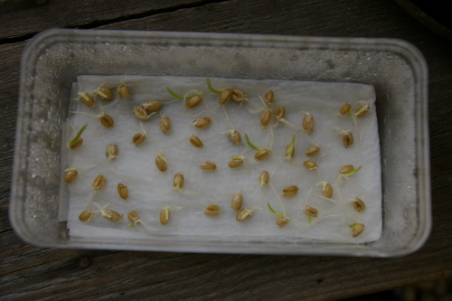 Hier Weizenkeimlinge auf Küchenpapier. Die könnten in dem stadium dann auch getopft und im Falle von Salat warmgestellt werden.