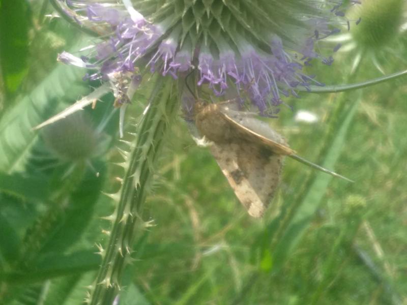 und dieser kleinere falter flatterte auch auffällig, wohl eine hausmutter (noctua pronuba)