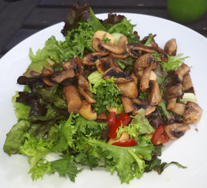 Gestern hatte ich den Abschied von meiner alten Schule. Da gab's ein Buffet. Abends habe ich dann nur einen gemus8chten Salat mit weißen Riesenbohnen und gebratenen Champignons gemacht