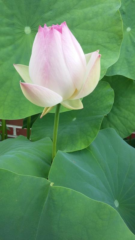 Das kalte Frühjahr hat die Lotosblume stark zurückgeworfen, aber jetzt erscheint die erste Knospe: