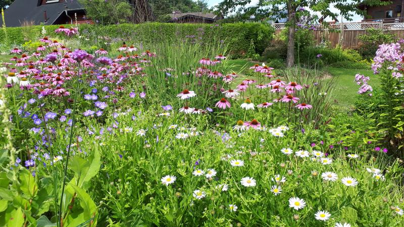 Der Ausblick, die Weite, das Prairie/wiesenartige in üppiger, bunter, ist auf jeden Fall das große Thema deines Gartens - aber du hast auch sehr schöne Räume mit der Beetführung und den gepflanzten Bäumen geschaffen.