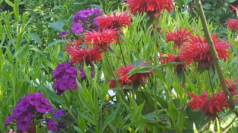 Die Monarden blühen hier jetzt auch. Zu der einen im Gräserbeet muss ich mal recherchieren, welche ich da gepflanzt hatte. Die ist gut brusthoch und setzt sich seit vielen Jahren gegen die umstehende Bepflanzung durch.
