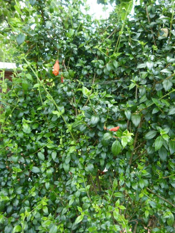 Mitraria coccinea, ein verholzender Strauch aus der Familie Gesneriaceae, bildet lange Triebe, die sich nicht selbst festhalten, aber auch nicht alleine standfest sind. Er ist bei uns wohl nicht winterhart, auch wenn ein paar Grade Frost von den älteren Trieben toleriert werden. Dieses Jahr blüht die Pflanze erstmalig: recht sparsam, ich hätte mir etwas mehr versprochen.
